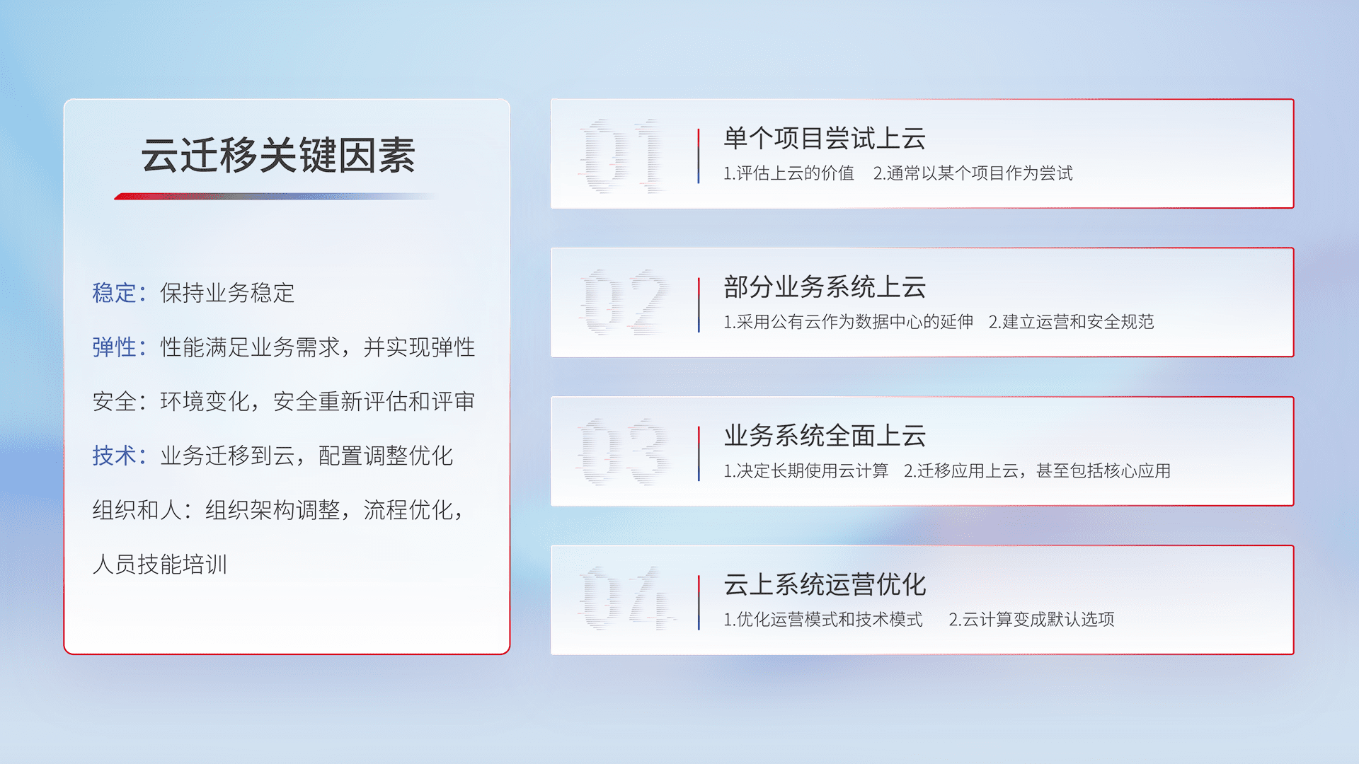 结合实际业务,,,从规划设计、、、云平台选型、、云原生改造、、、、数据迁移、、、集成交付,,,迁移全过程为客户识别最佳上云路径,,,,做好风险识别管理,,,设计网络架构、、、身份权限、、、、安全审计合规、、操作审计、、日志审计、、、监控告警策略、、、多站点容灾设计等,,对云上基础设施进行整体规划,,提升IT治理水平,,以满足弹性、、高可用、、高性能的需求。。