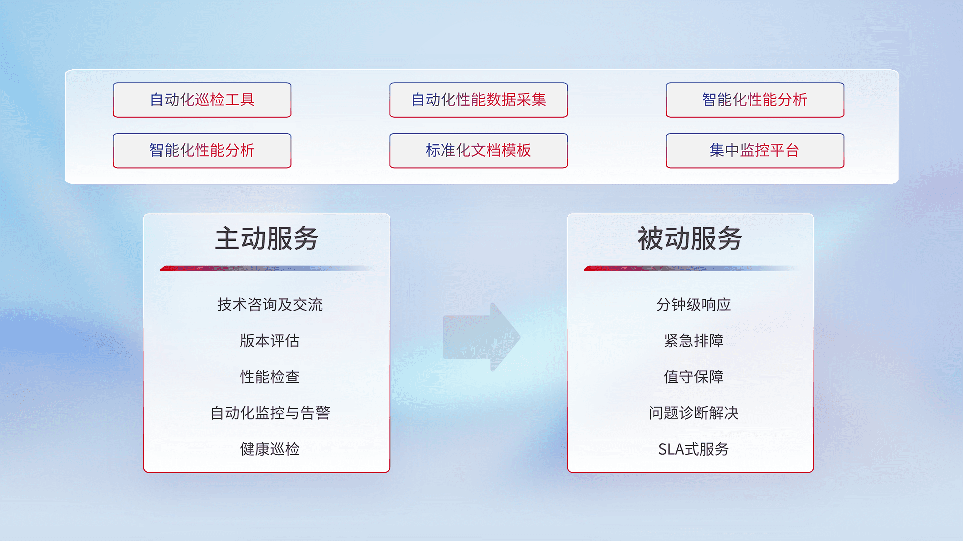 智能化工具和标准化文档,,保障服务质量,,,,提供主动服务(包含技术咨询、、、版本评估、、性能检查、、、自动化监控与告警、、健康巡检)和被动服务包含(分钟级响应、、、、紧急排障、、、值守保障、、、、问题诊断解决、、、、SLA服务)。。。。